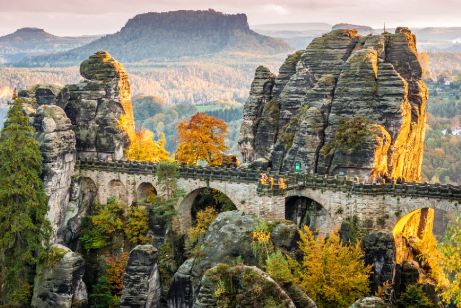 Suisse saxonne avec l'impressionnant pont de Bastei construit il y a deux siècles entre d'étonnantes formations rocheuses, au cœur du Massif gréseux de l'Elbe. De magnifiques paysages qu'on ne s'attend pas à trouver en Allemagne.