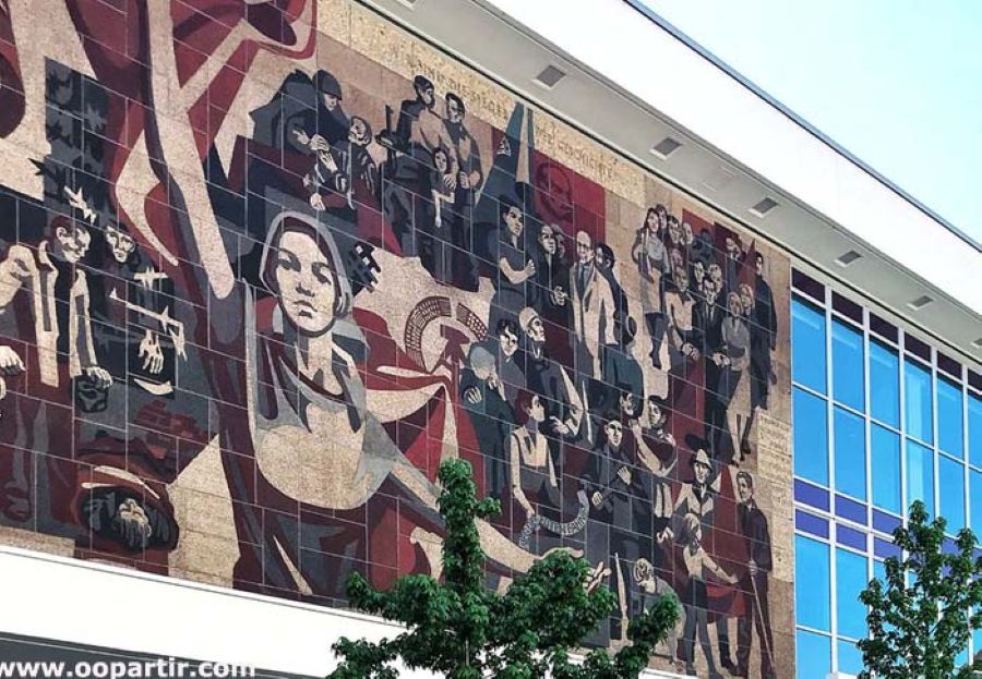 Dresdner Kulturpalast, salle de concert de style bauhaus ayant réouvert en 2017, un lieu connu aussi pour sa façade et sa peinture murale «Le chemin du drapeau rouge» typique de l'époque communiste.