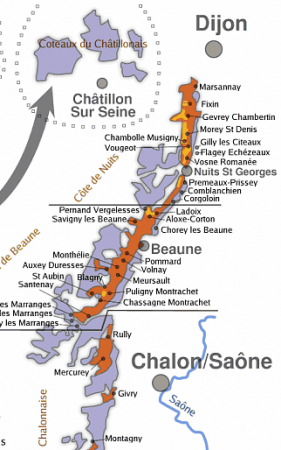 Le vignoble s'étend au sud de Beaune et au nord-est vers Dijon, de la Butte de Corton jusqu'au sentier des Crêtes à Santenay. La Route des Grands Crus déroule un itinéraire touristique balisé d'une soixantaine de kilomètres, le long des côtes de Nuits et des côtes de Beaune.