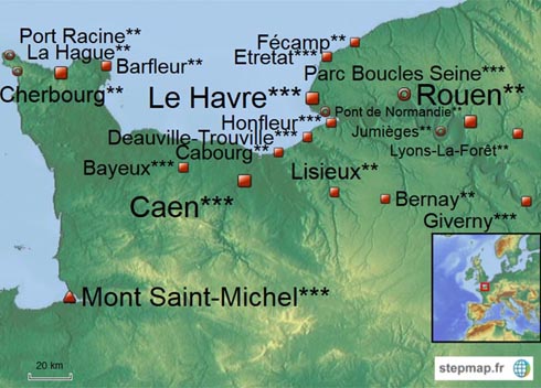 Arromanches-les-Bains, Calvados, Bayeux, Cabourg, Caen, Courseulles-sur-Mer, Deauville, Dives-sur-Mer, Falaise, Honfleur, Houlgate, Lisieux, Mondeville, Ouistreham, Port-en-Bessin-Huppain, Trouville, Vire, Manche, Avranches, Barneville-Carteret, Cherbourg, Granville, Le Mont Saint Michel, Pontorson, Orne, Alençon, Argentan, Bagnole de l'OrneCliquez sur la carte pour agrandir