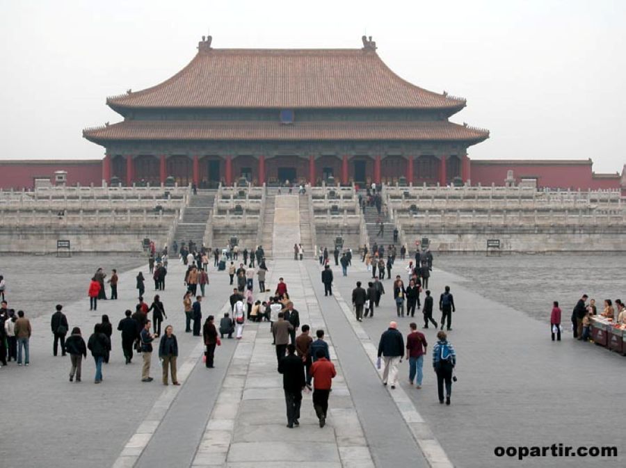 Pékin, la capitale chinoise, est une ville immense. Son coeur historique permet toutefois de le découvrir à pied. La visite de la "Cité pourpre interdite" prend à elle seule au moins quatre heures. On en saisit mieux la taille en grimpant au sommet de la Colline du Charbon voisine: la vue y est saisissante à l'aube ou au crépuscule. La Cité interdite est une ville dans la ville, splendide et surpeuplée (de touristes).