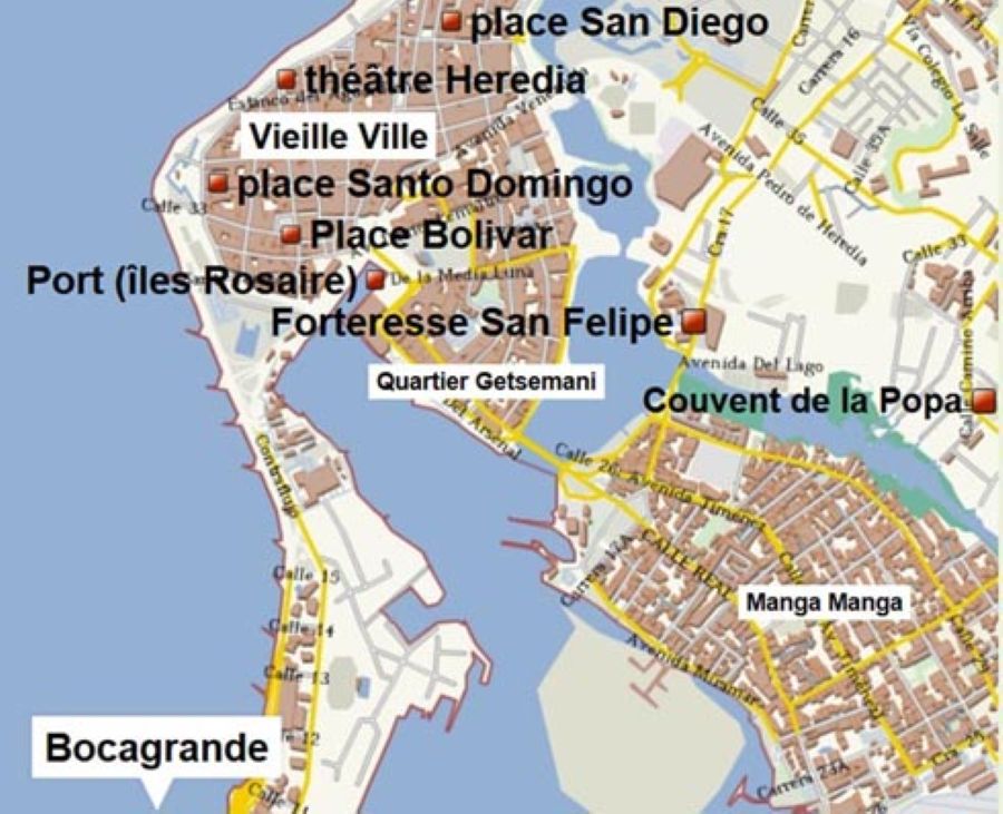 «Ciudad Vieja» (vieille ville), son cœur historique, et dans une moindre mesure Bocagrande, une sortie de Miami tropical, longue barre d’immeubles modernes bordant la mer des Caraïbes, construits en lieu et place des anciennes maisons Art déco.