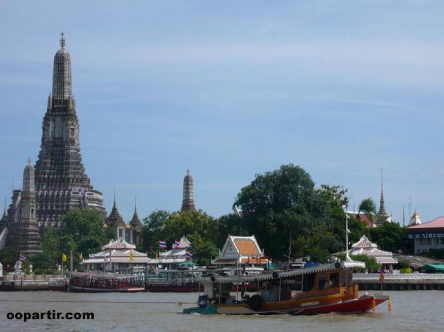 En face du Palais Royal, de l'autre côté du fleuve, sur la rive de Thonburi, se dessine la silhouette du Wat Arun ou temple de l'aube, avec sa haute tour (le prang central) aux influences khmères et idiennes.