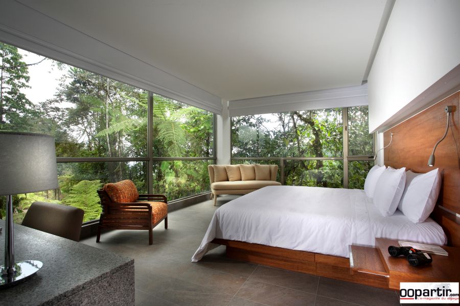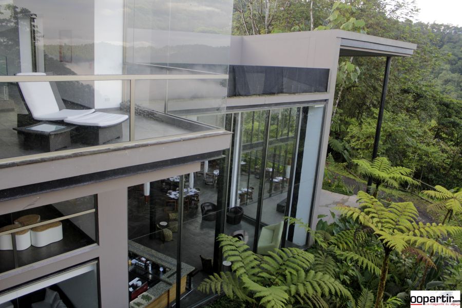 Au bout d'une route en terre surgit enfin le Mashpi Lodge, un hôtel de luxe résolument contemporain. Sa décoration minimaliste allie un mélange de tons chauds et de touches de couleurs vives, des lignes douces, des angles surprenants. Partout les vues sur la forêt sont magnifiques, dans les parties communes comme dans les chambres. Le lodge est situé sur un plateau élevé en pleine montagne. Ses terrasses invitent à la contemplation et la détente.