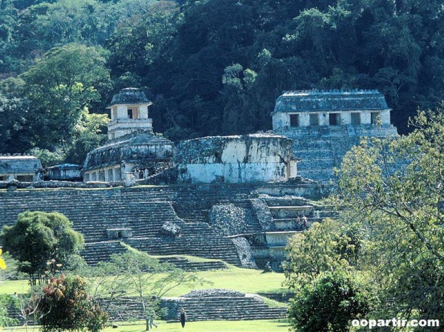 Palenque, cité maya située en bordure de la forêt vierge. Son célèbre temple des Inscriptions s'inscrit dans un cadre merveilleux, à l'orée de la Selva Lacandona, cette dense jungle tropicale abritant de nombreux autres sites mayas tels
