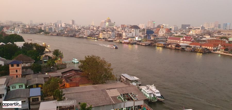 En face du Palais Royal, de l'autre côté du fleuve, sur la rive de Thonburi, se dessine la silhouette du Wat Arun ou temple de l'aube, avec sa haute tour (le prang central) aux influences khmères et idiennes.